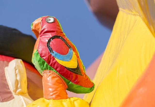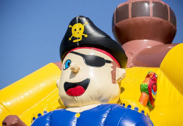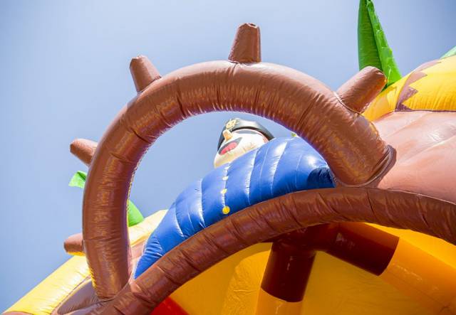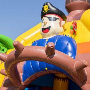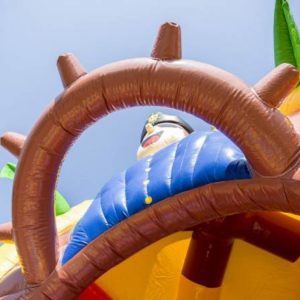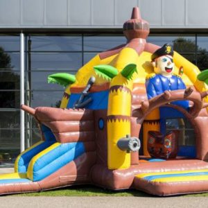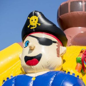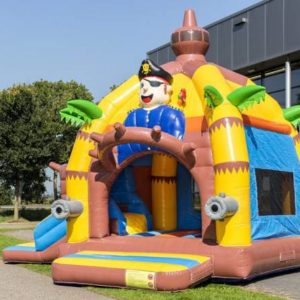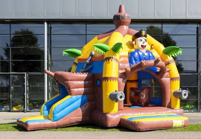 Ahoj, barátaim! Üdv ebben a klassz kalózos ugrálóvárban! Ez az ugrálóvár szórakoztató témával rendelkezik, valamint szemet gyönyörködtető színekben pompázik, amely azonnal felhívja a gyermekek figyelmét, különösen a 3D-s kalóz és az ágyúk az elején. A kalózos téma az ugrálóvár belsején és a külsején is megtalálható. Ez az ugráló tetővel ellátott, és széles belépővel rendelkezik ahhoz, hogy könnyebben mászhassanak be a gyerekek az ugrálófelülethez.