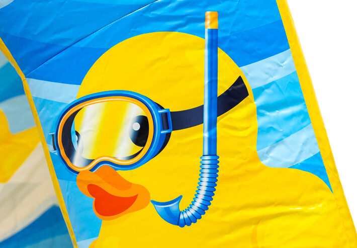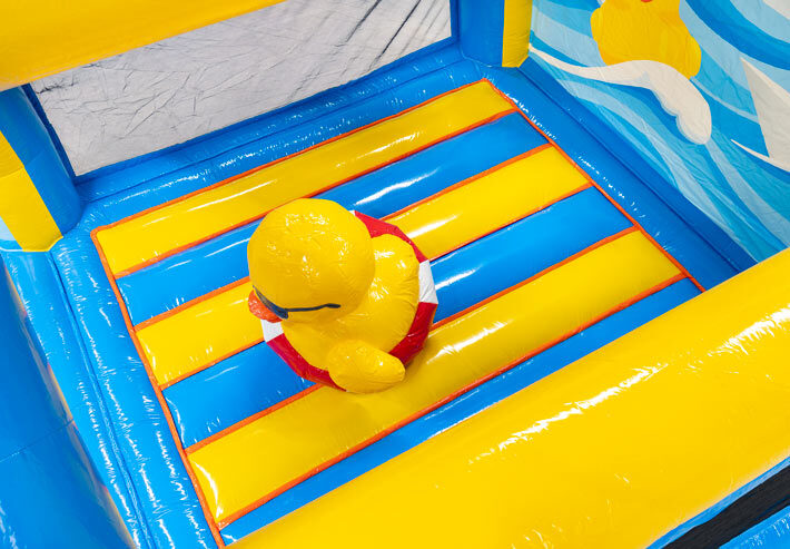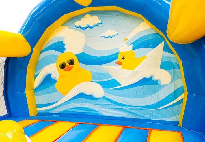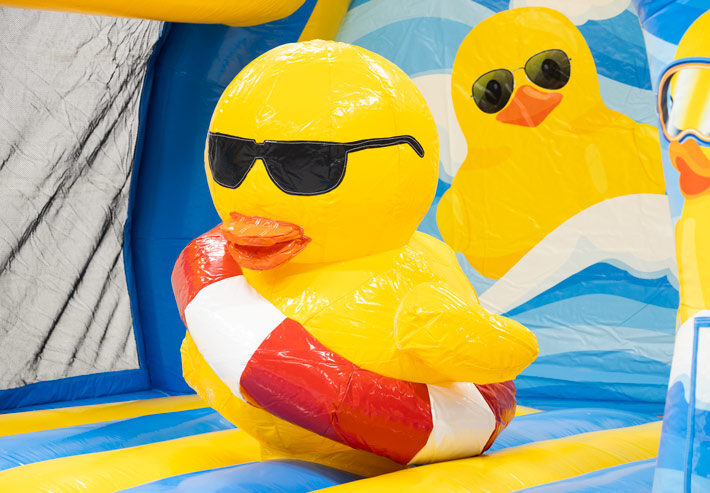 Ki szeret strandolni? Elmaradhatatlan kellék a gumikacsa, pláne ha menő napszemüvege is van! A légvárat díszítő hullámok és vagány kacsák között igazi felüdülés lesz az ugrálás. A légvár felül nyitott, viszont oldalt hálóval, hátul teljesen zárt a maximális biztonság érdekében. Mindenki szeretni fogja ezt a légvárat!
